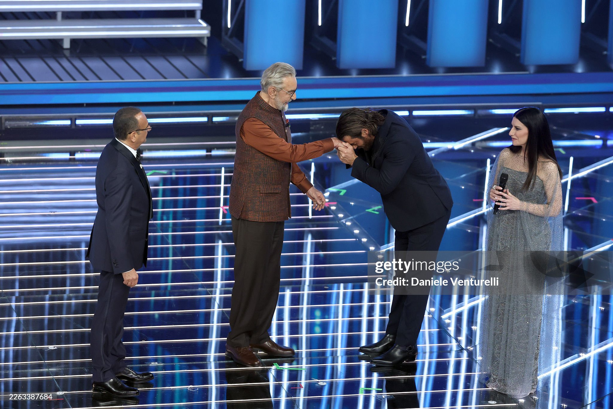 Кабир Беди, участник Сандемо 1976 года, входит в зал «Аристон», и его встреча становится легендарной. «Спасибо за любовь и уважение, которые вы оказывали мне на протяжении 50 лет», - говорит он. Затем он добавляет: «Фестиваль в Санремо известен во всем мире».